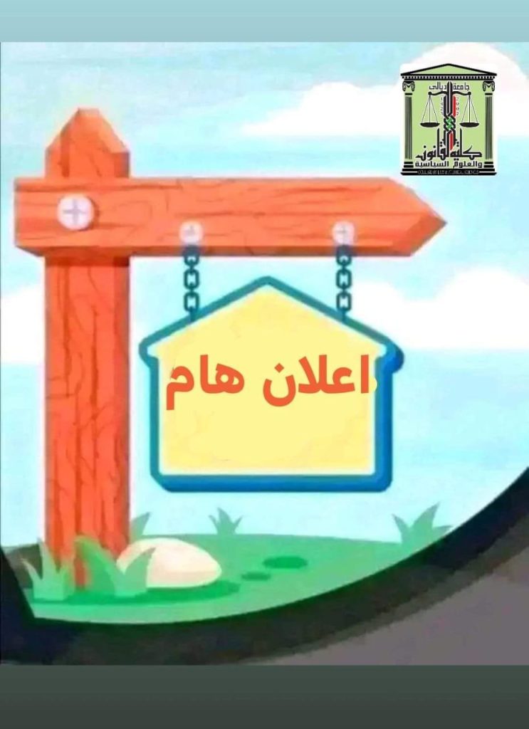 تدعو كلية القانون والعلوم السياسية الطلبة المتقدمين إلى الدراسة المسائية ممن سبق لهم مراجعة شعبة التسجيل في الكلية وتم تسجيل أسمائهم واستلام استمارة التقديم، إلى مراجعة شعبة التسجيل المسائي لتسليم الفايلات واستكمال إجراءات التسجيل.