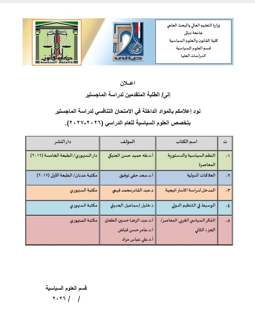 تعلن كلية القانون والعلوم السياسية عن مواد الامتحان التنافسي للمتقدمين للدراسات العليا في تخصص العلوم السياسية