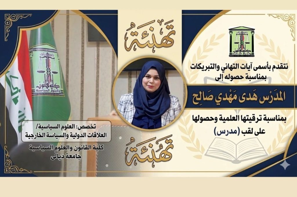 تتقدم عمادة كلية القانون والعلوم السياسية متمثلة بعميدها الأستاذ الدكتور عبد الرزاق طلال جاسم السارة المحترم واعضاء الهيأة التدريسية ومنتسبيها كافة بأحر التهاني والتبريكات إلى المدرس هدى مهدي صالح المحترمة