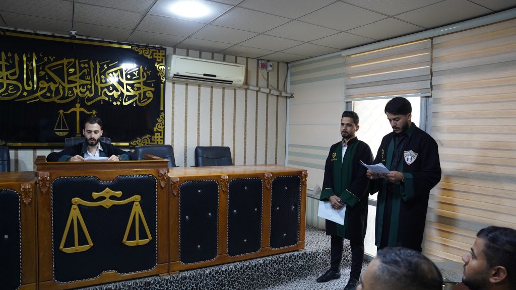 حيث تم تقسيمهم الى فرق يتولى كل فريق كتابة سيناريو القضية وتوزيع الادوار من حيث قضاة المحكمة اطراف الدعوى المدعي والمدعى عليها ووكلائهم من المحاميين، وباقي الأطراف الذين لهم علاقة بالدعوى وغيرهم، وذلك تحت اشراف وتوجيه استاذ المادة.