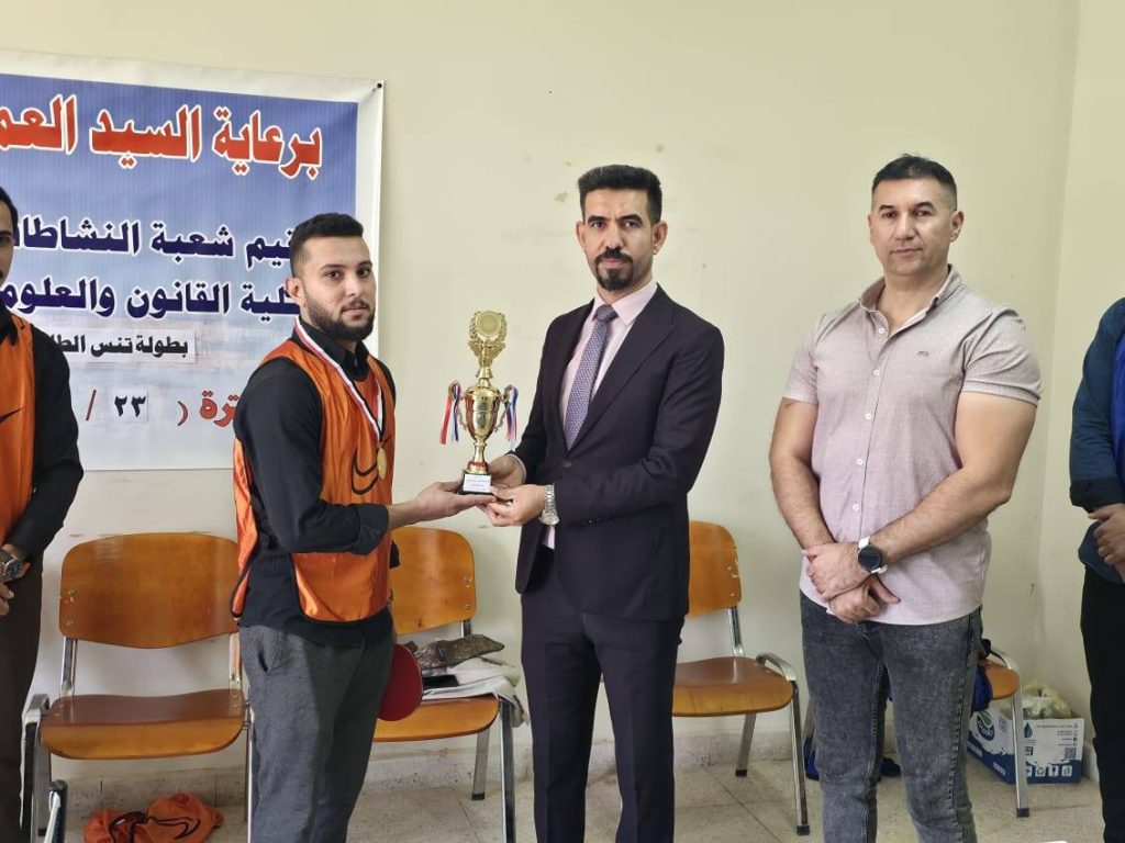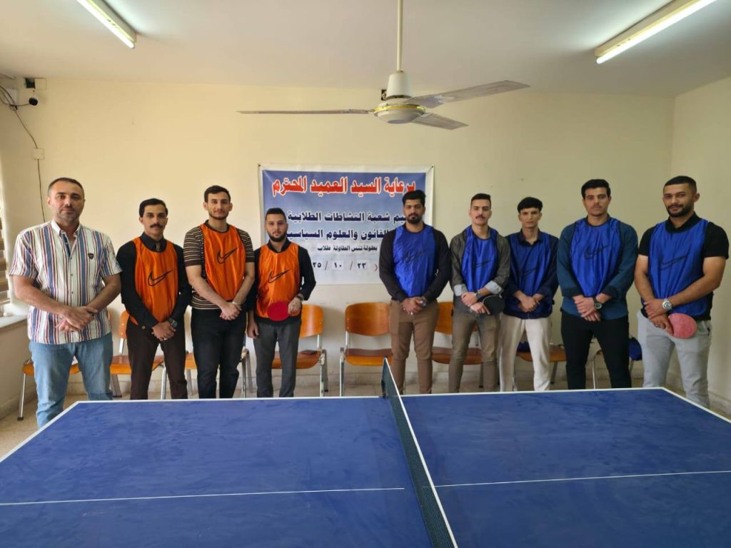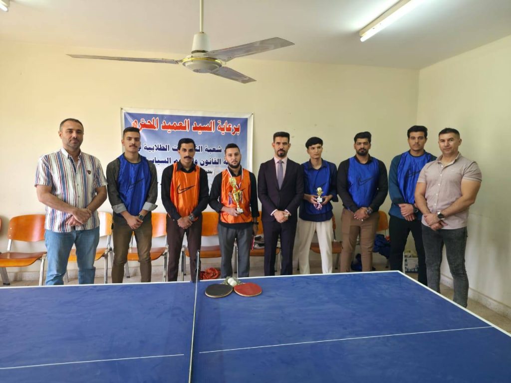 برعاية السيد رئيس جامعة ديالى الأستاذ الدكتور تحسين حسين مبارك المحترم، وبإشراف عميد كلية القانون والعلوم السياسية الأستاذ الدكتور عبد الرزاق طلال جاسم السارة المحترم، اختتمت شعبة النشاطات الطلابية في الكلية بطولة تنس الطاولة للطلبة التي شهدت مشاركة متميزة من طلبة قسمي القانون والعلوم السياسية.