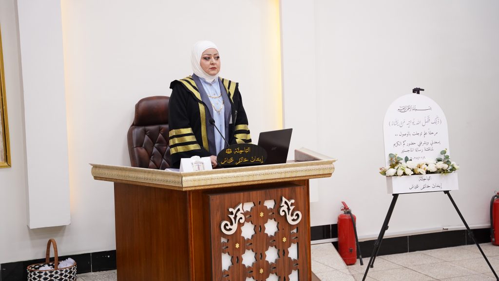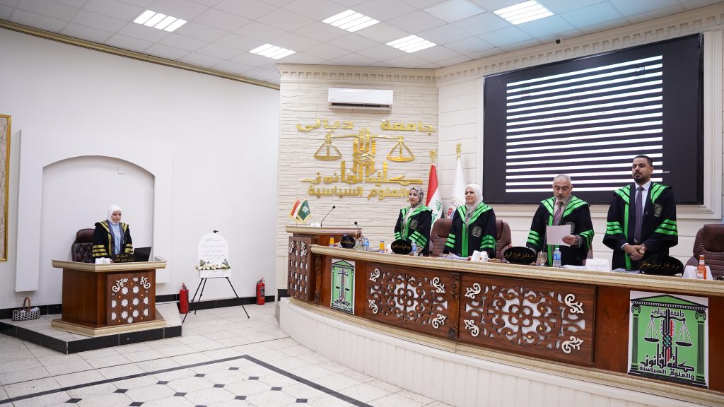 ، للطالبة ايمان حاتم عباس ، وذلك من يوم الخميس الموافق (6/11/2025 ) على رحاب قاعة العدالة في الكلية. تألفت لجنة المناقشة من الاستاذ المساعد الدكتور تغريد محمد قدوري عضواً ، والاستاذ المساعد الدكتور عمر موسى جعفر عضواً ، والاستاذ المساعد الدكتور شهلاء سليمان محمد عضواً ومشرفاً فيما ترأس لجنة المناقشة الأستاذ الدكتور منتصر علوان كريم .