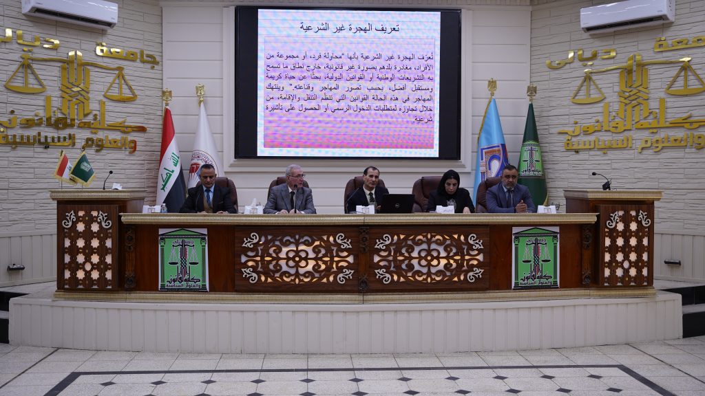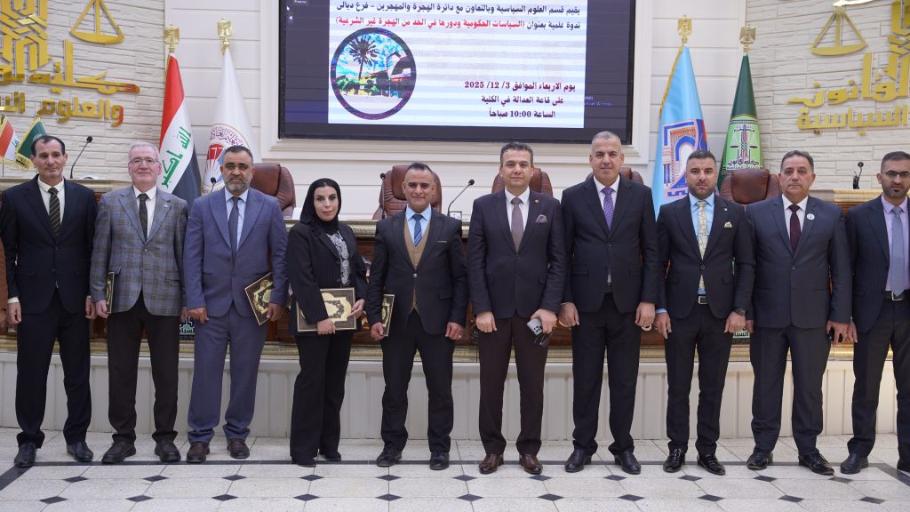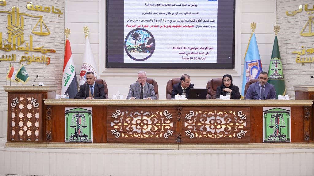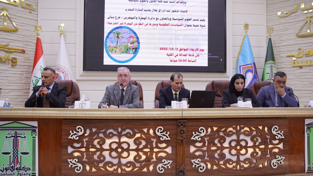 برعاية السيد رئيس جامعة ديالى الأستاذ الدكتور تحسين حسين مبارك المحترم، وبإشراف السيد عميد كلية القانون والعلوم السياسية الأستاذ الدكتور عبد الرزاق طلال جاسم السارة المحترم، وضمن إطار الحملة الوطنية للحد من الهجرة غير الشرعية، نظم قسم العلوم السياسية بالتعاون مع شعبة الإعلام والاتصال الحكومي في الكلية ودائرة الهجرة والمهجرين – فرع ديالى، ندوة علمية بعنوان “السياسات الحكومية ودورها في الحد من الهجرة غير الشرعية”.