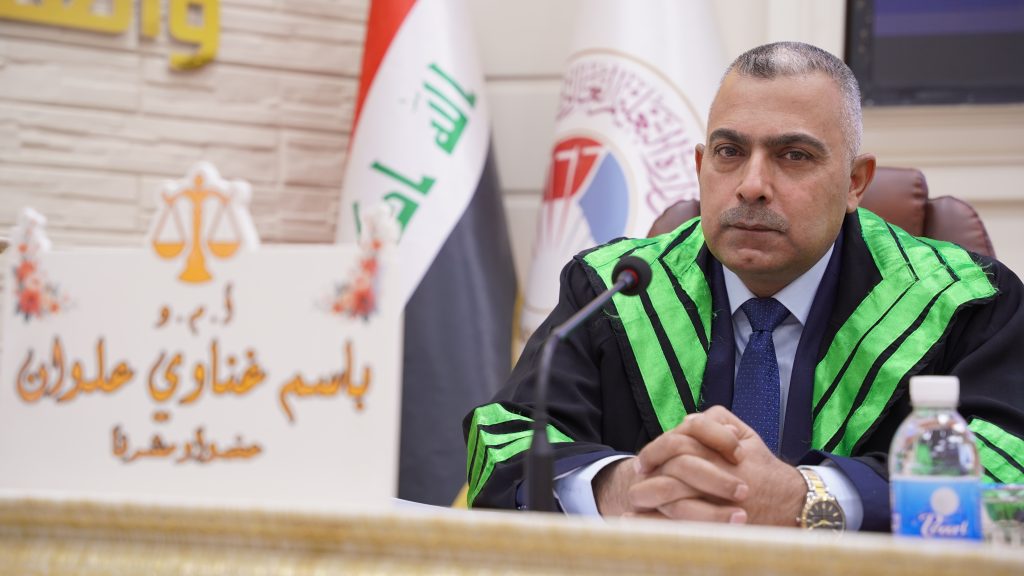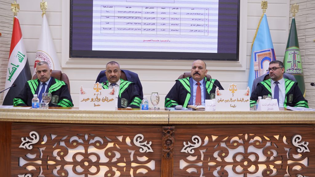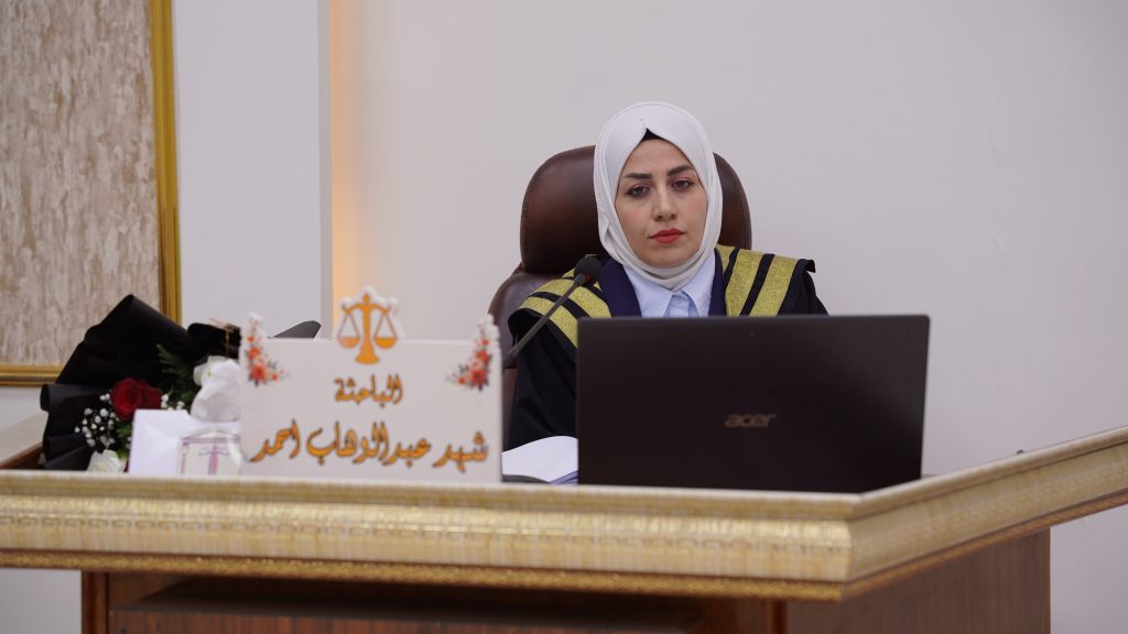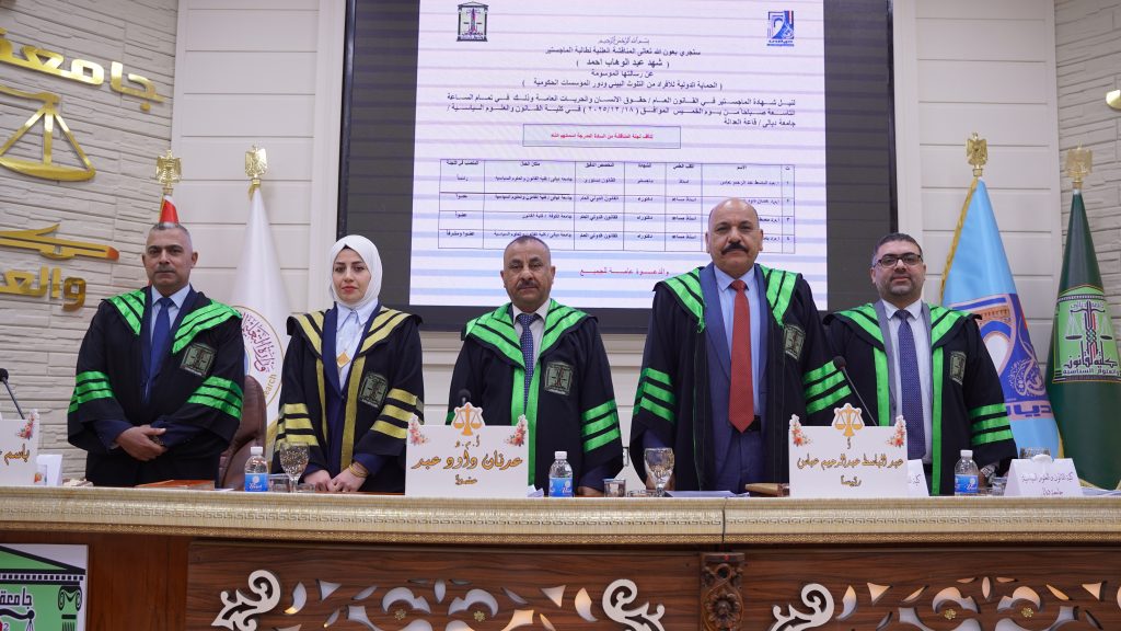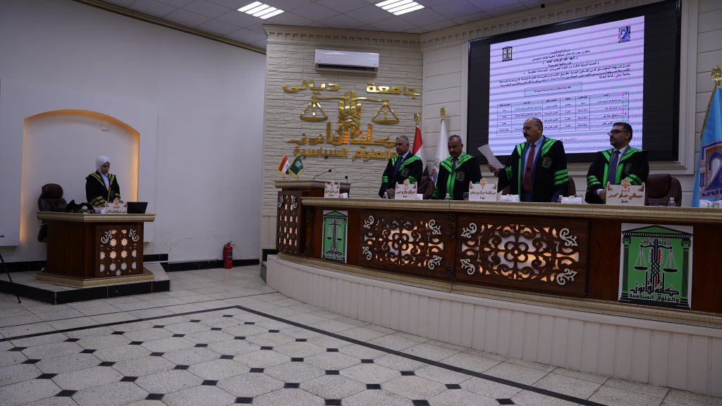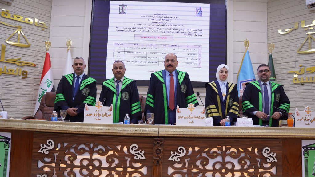 ، للطالبة شهد عبد الوهاب احمد وذلك من يوم الخميس الموافق (١٨ / ١٢/ ٢٠٢٥ ) على رحاب قاعة العدالة في الكلية. تألفت لجنة المناقشة من الاستاذ المساعد الدكتور عدنان داود عبد عضواً ، والاستاذ المساعد الدكتور مصطفى عماد محمد عضواً ، والاستاذ الدكتور باسم غناوي علوان عضواً ومشرفاً فيما ترأس لجنة المناقشة الاستاذ عبد الباسط عبد الرحيم .
