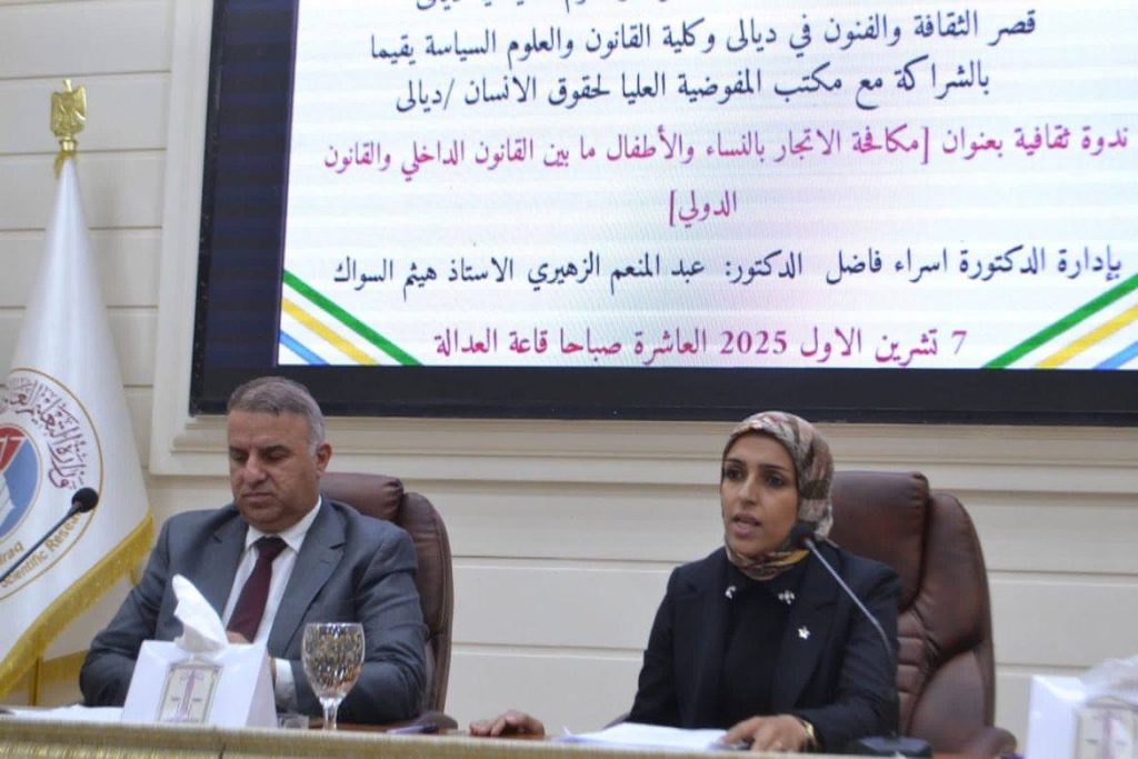 أدار الجلسة المدرس الدكتور إسراء فاضل، وشارك فيها كلٌّ من المدرس الدكتور عبد المنعم الزهيري حيث تناول المحاضران الأطر القانونية الوطنية والدولية لمكافحة جرائم الاتجار بالبشر، ولا سيما النساء والأطفال، وبيّنوا الجهود التي تبذلها الدولة العراقية والمجتمع الدولي للحد من هذه الظاهرة التي تمس القيم الإنسانية وكرامة الإنسان كما عرض مقطع فديوي